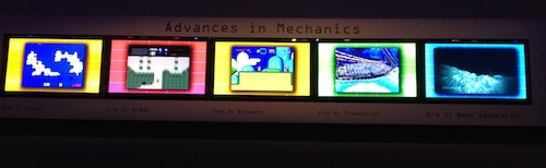 In that same room, they also had a giant frame containing five screens with the words “Advances in Mechanics” at the top. Each sequence would start with a game mechanic such as running, jumping or even cutscenes would come up on the screens. Each monitor would then display how that mechanic looked during each of the eras of video game design. Sometimes it’s hard to appreciate just how far even small things like these have come until you can see the progression side-by-side. It was a lot of fun to be able to reminisce about how good or bad those mechanics used to be in their day.